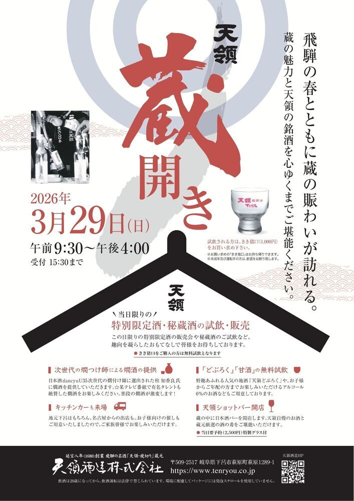 蔵開き2026 開催決定! 2026年02月01日 年に一度の「蔵開き2026」を、3月29日(日)に開催いたします。 当日限定の特別酒・秘蔵酒の試飲販売や、天領商品が当たる抽選会など、限定企画をご用意しております。 また、前日には下呂温泉にて花火イベントも予定されています。 温泉や観光とあわせてお立ち寄りください。 詳細はSNS・オンラインショップのお知らせにて順次ご案内いたします。 «前 次» お知らせ