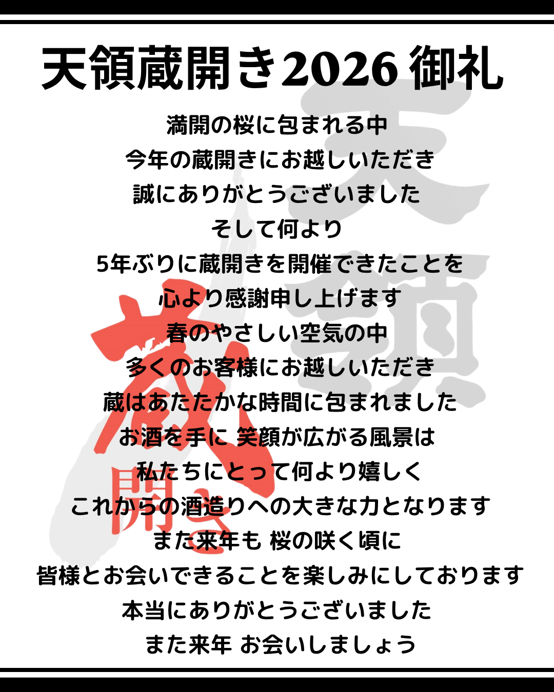 蔵開き開催の御礼 2026年03月30日 昨日は5年振りの蔵開きにお越しいただき誠にありがとうございました。 お越しいただきました皆様のお陰で、無事に開催する事ができました。 来年も桜が満開の季節に開催をさせていただきます。 ぜひ来年もお越しくださいませ。 パワーアップして開催させていただきます。 引き続きよろしくお願いいたします。 次» お知らせ
